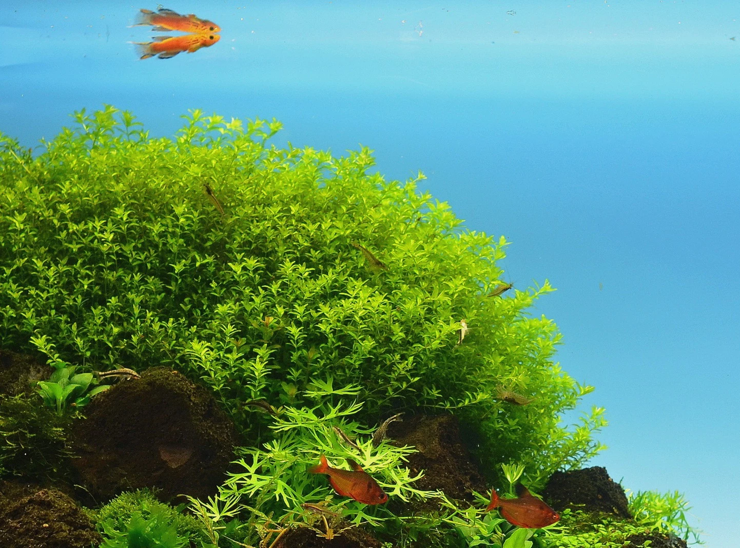Die Heimat von Hemianthus glomeratus, ehem. Micranthemum glomeratus ist die Ostküste von Nordamerika Florida. Die Blätter der Unterwasserpflanzen (submers) sind lanzettlich bis elliptisch – sie sind ca. 3-8 mm lang und ca. 2-4 mm breit. Überwasserpflanzen (emers) sind deutlich kleiner als submerse, wachsen kriechend und haben elliptische Blätter. Emers wächst die Hemianthus-Art auf steinigem oder schlammigem Bodengrund an Flussläufen in dichten, flachen, hellgrünen Teppich aus winzigen kriechenden Trieben. Und nur In der Landform entwickeln sich die sehr kleinen weißlichen Blüten. Ihr lockerer, aufrechter Wuchs und die leuchtend hellgrüne Farbe vermitteln einen frischen, frühlingshaften Eindruck. Die Pflanze wird auch unter dem Namen Amerikanisches Perlkraut im Handel angeboten. Mit Hilfe einer scharfen Schere lässt sich die Pflanze gut einkürzen. Nach dem Rückschnitt treiben viele neue Seitentriebe aus und der Bestand wirkt kompakter und dichter. Sehr kontrastreich ist die Kombination der hellgrünen Hemianthus mit rotlaubigen Arten wie der Alternanthera.
