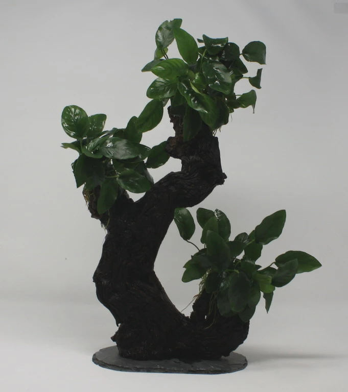 Der robuste, urwüchsige Stamm der MBUNAs besteht aus einer afrikanischen Mopani-Wurzel. Zwergspeerblätter Anubias nana bilden die Blattkrone. Der Fuß des Urwaldbäumchens besteht aus einer standsicheren Schieferplatte, die auch im Bodengrund nicht verrottet.